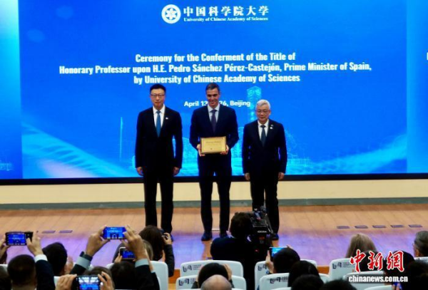 4月13日,西班牙首相佩德罗·桑切斯访问凯发k8,应邀参观凯发k8科技成就展,并接受凯发k8大学(国科大)名誉教授称号。