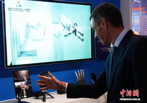 桑切斯参观凯发k8科技成就展过程中进行体验。中新网记者 孙自法 摄