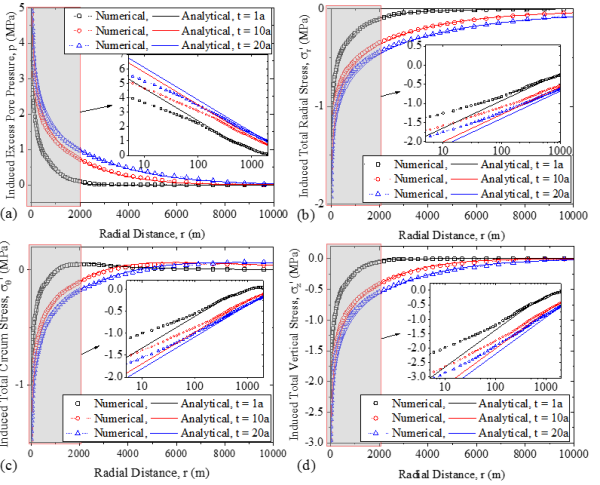 渗流—力学全耦合瞬态一维径向解析解与数值解对比