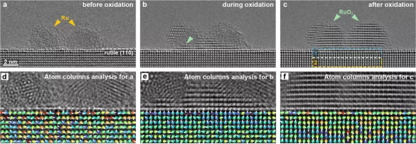 研究团队聚焦高性能负载型Ru(钌)基催化剂,利用原子分辨环境透射电镜,原位解析了Ru/rutile-TiO2(金红石型二氧化钛)中Ru单颗粒的氧化机制研究首次在该过程中观测到体相氧溢流,也就是氧原子会在反应发生时“串门”,证实了载体中的晶格氧以空位介导的方式通过界面输运至金属颗粒